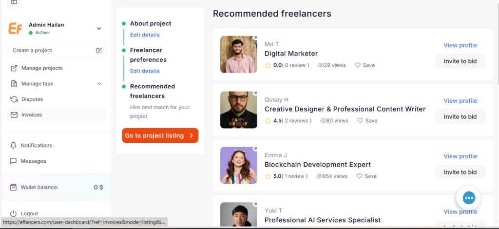 - Review recommended freelancers or publish the project and wait for bids